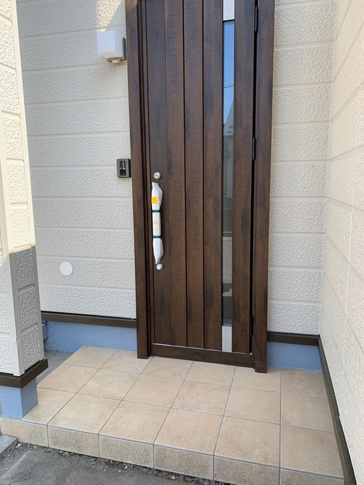 玄関ドアは白のドアから木目のドアへ交換。